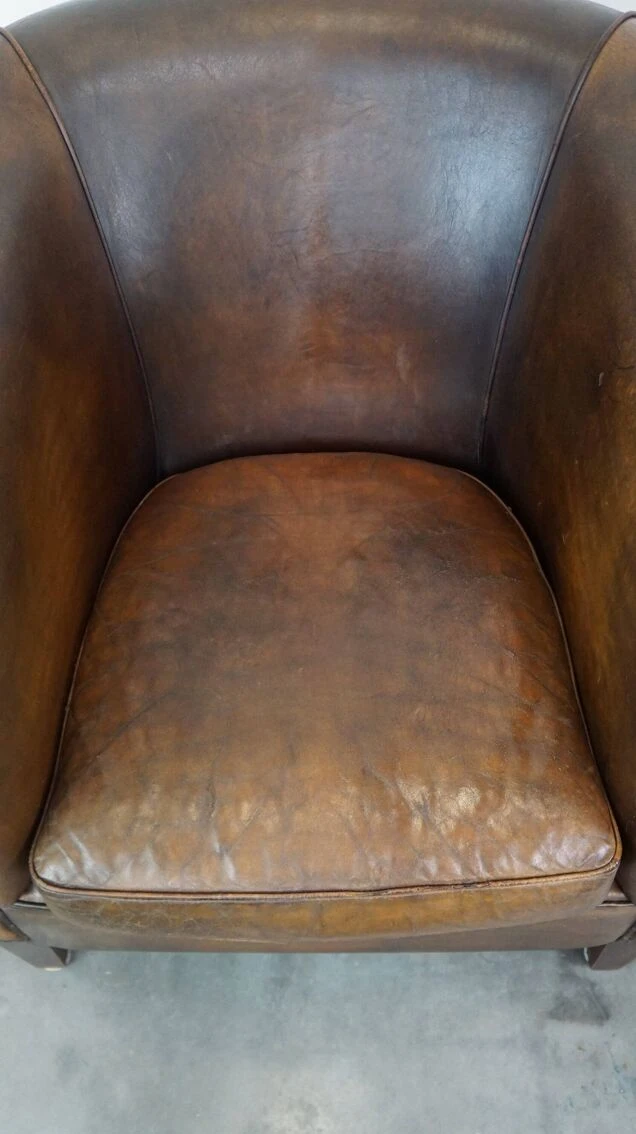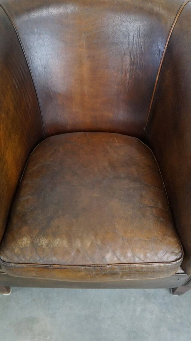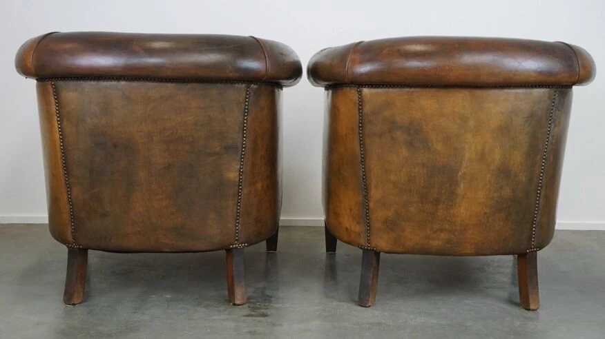 This robust set of beautifully colored sheepskin leather club armchairs has acquired a lovely patina through their life experiences.