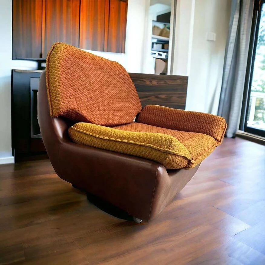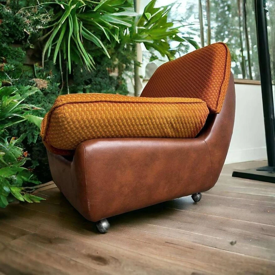 [ ] single seater 82 X 88 X 75 h single seat / club armchair / vintage armchair from the 70s, on casters retro seat in brown imitation leather, 2 cushions at the top, these do not have a zipper and are discolored n’ feel free to take a look among my other articles for more fun articles.
