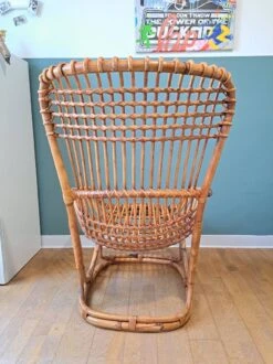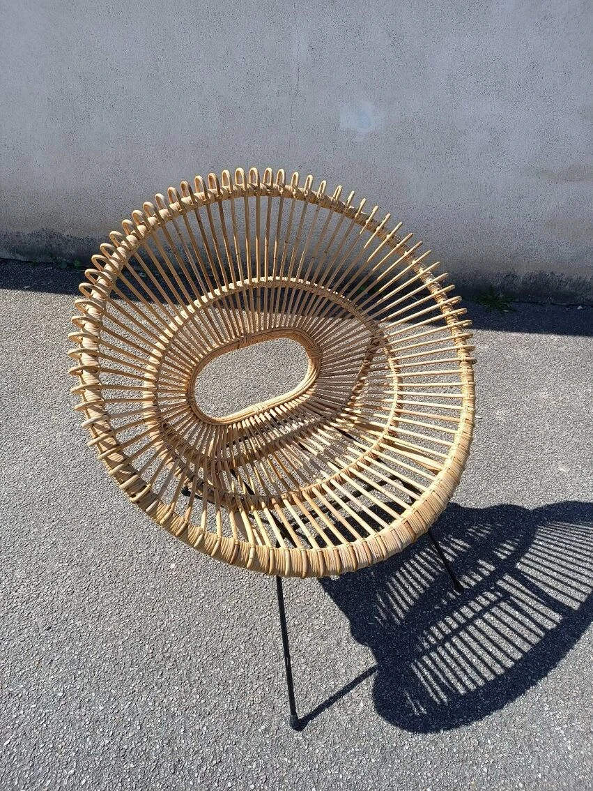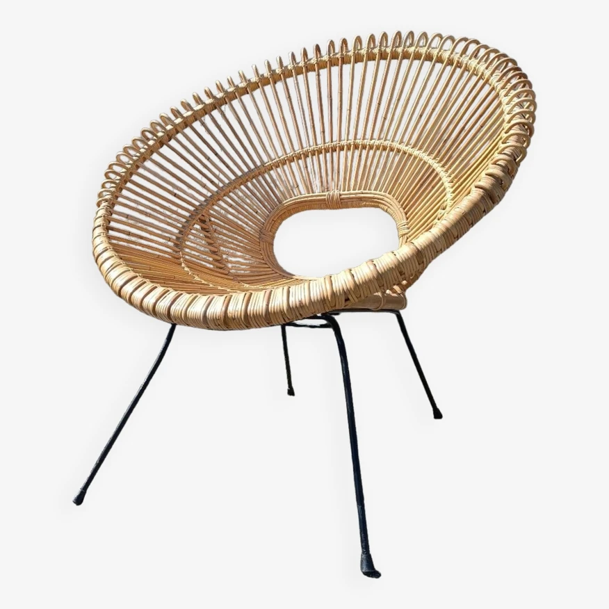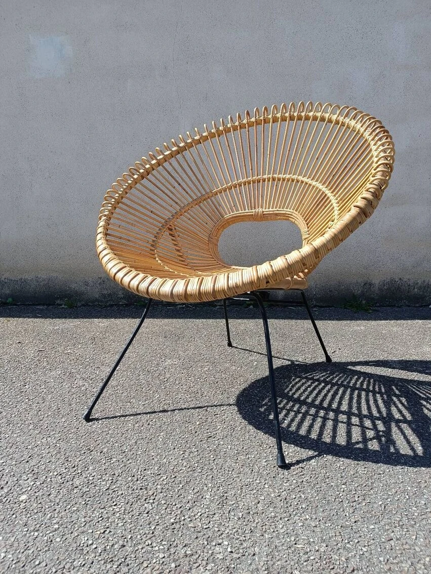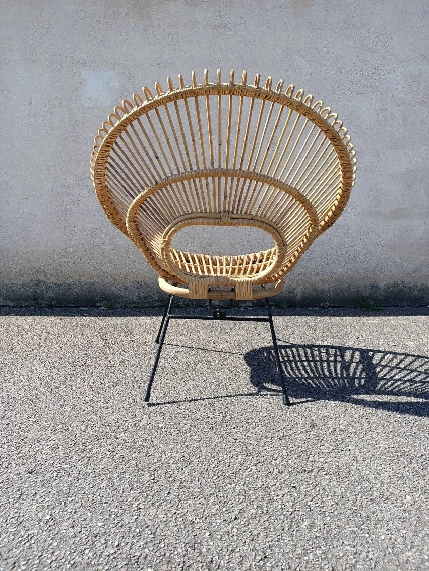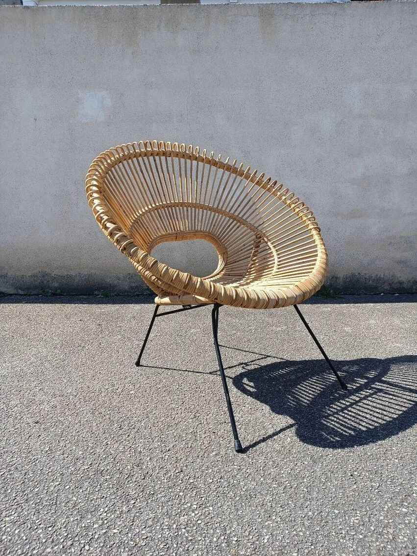 Superb rattan armchair from the 50s black steel legs in perfect condition dimensions height 87 cm width 85 cm seat height 39 cm depth 65cm.