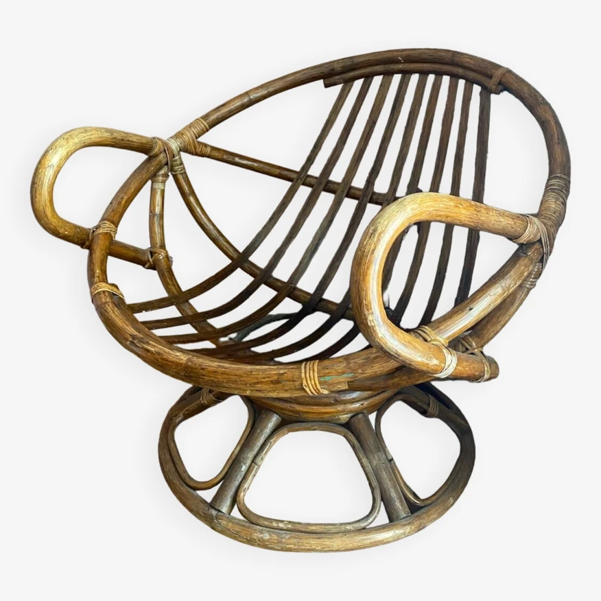 Magnificent rattan armchair from the 70s, very comfortable swivel with a soft cushion for indoor or outdoor use.