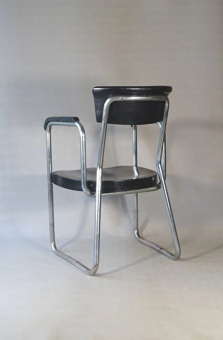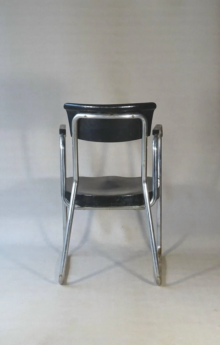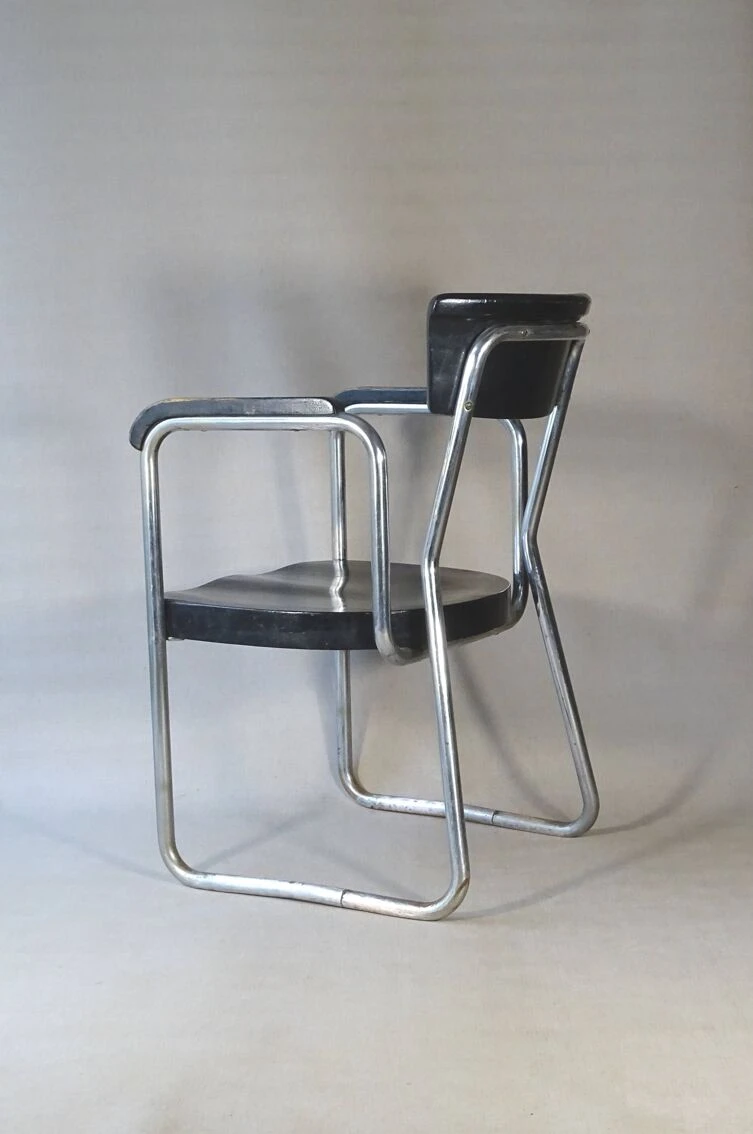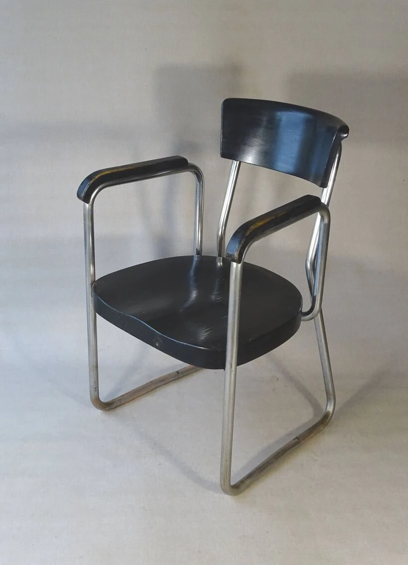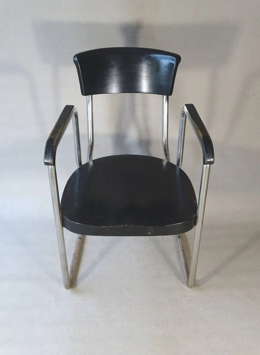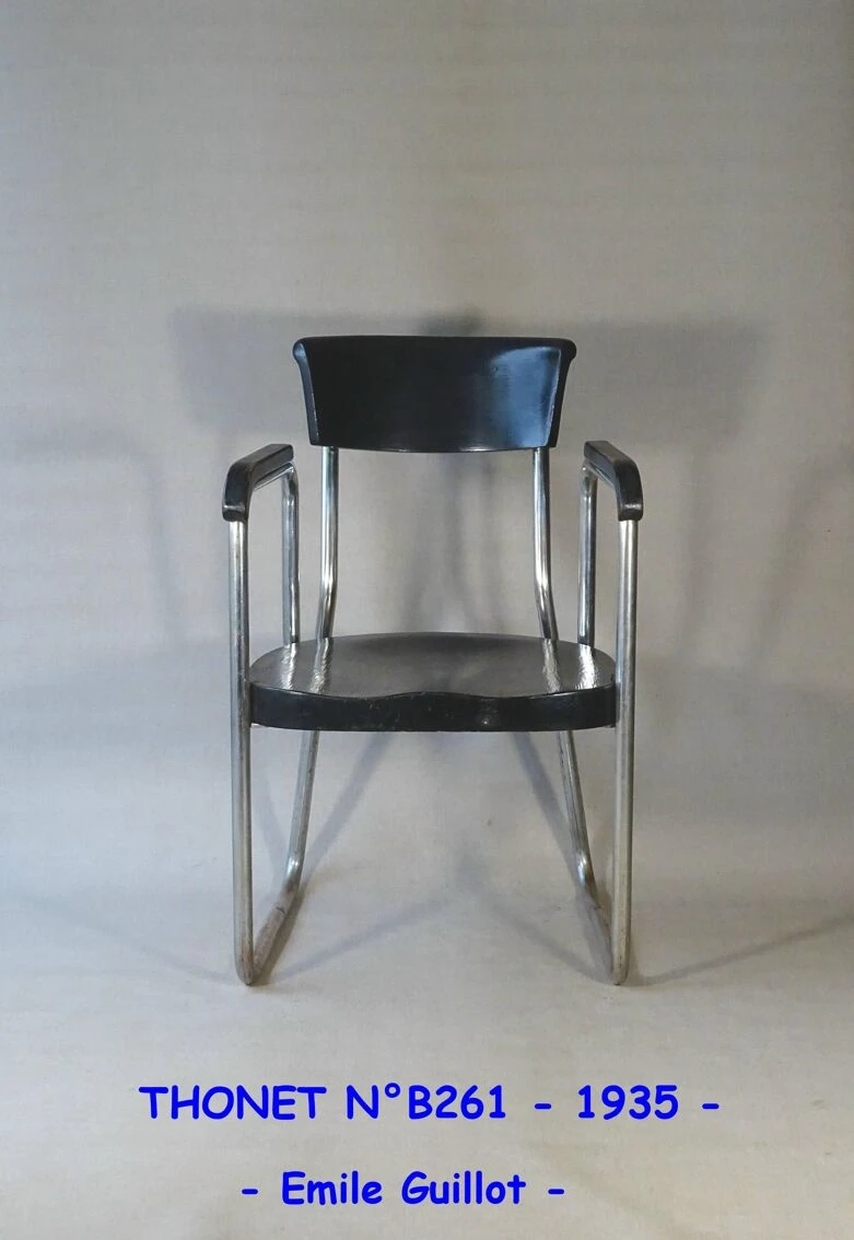 Bauhaus Cantilever armchair, steel tube and curved wood. Published by Thonet between 1932 and 1935 under number B261. It is the work of a French designer: Emile Guillot (1892-1960) The organization of the forces and the overhang is unique and certainly exclusive. The chrome of the tubing is original and in good condition, only traces of friction appear at the points of contact with the ground (underneath). The seat is shaped like a “saddle” for more comfort, and certainly elegance! This armchair was produced in two versions, a standard one with a seat height of 47cm and this one called “relaxation” with a seat height of 42cm. Dimensions: Height: 82 cm – Seat height: 42 cm – Width HT: 52 cm – Depth HT: 56 cm This seat is signed with a stamp in the wood of the saddle. More photos and information on request. For shipping outside Europe, the armrest cuffs and the backrest will be dismantled. Delivery France and Europe or collection Alsace