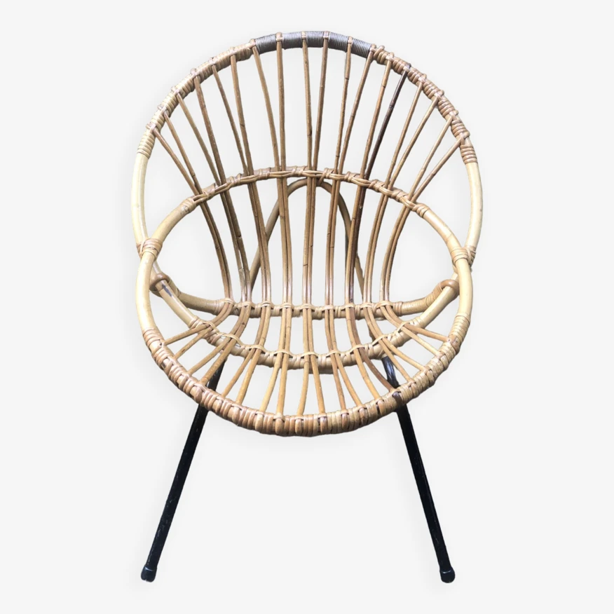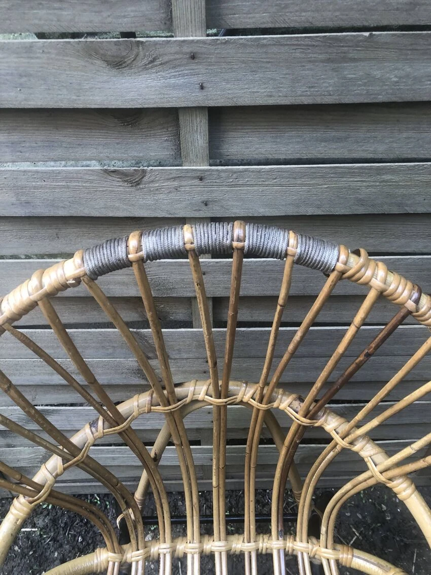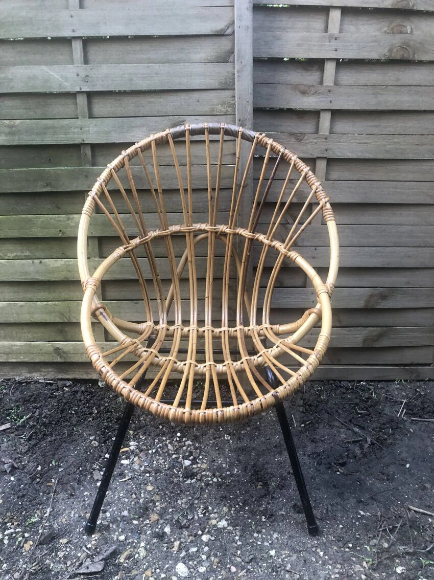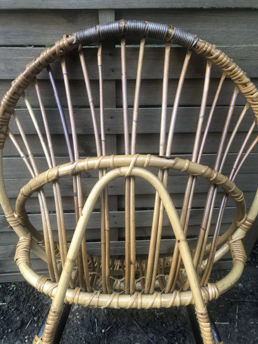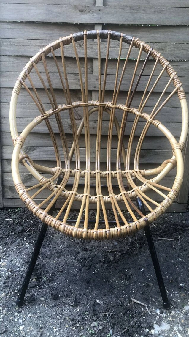 Shell armchair in bamboo rattan structure in black tubular metal in good condition apart from a very well executed repair at the top of the back h 78 w 60 d 57 seat h 36.