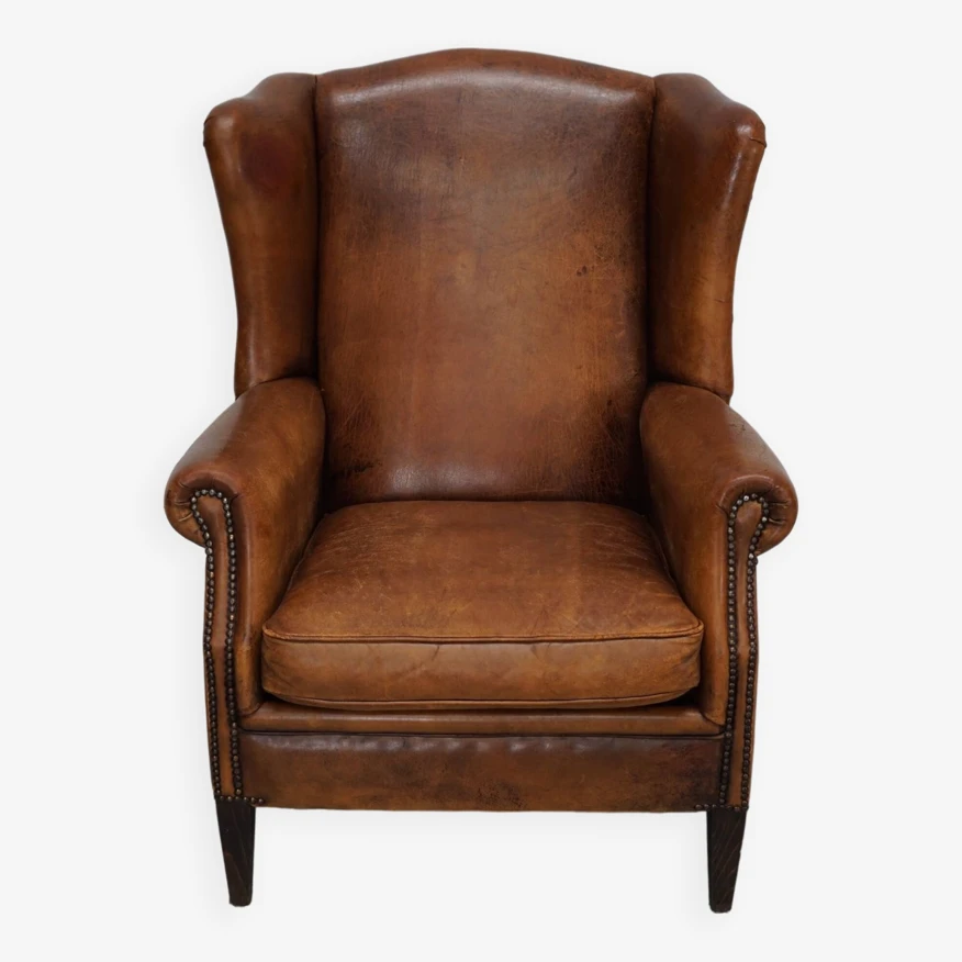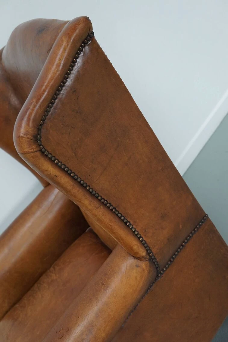 It is upholstered with cognac-colored leather and features metal rivets and wooden legs.