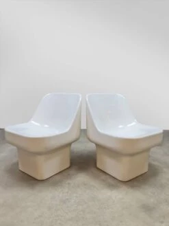 These chairs are made of white fiberglass, which gives them a modern look despite their age.