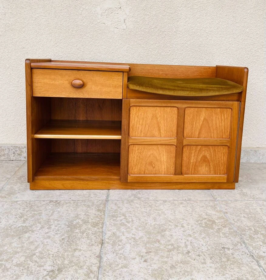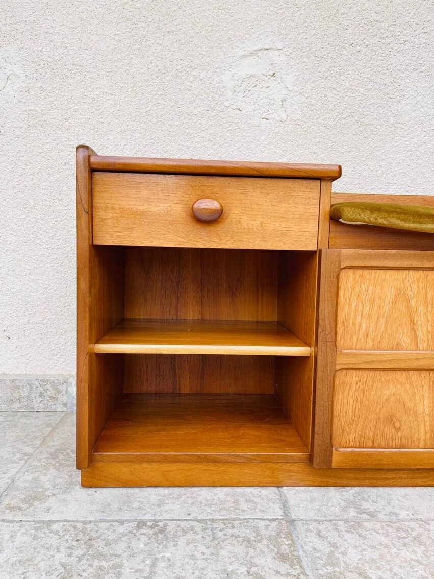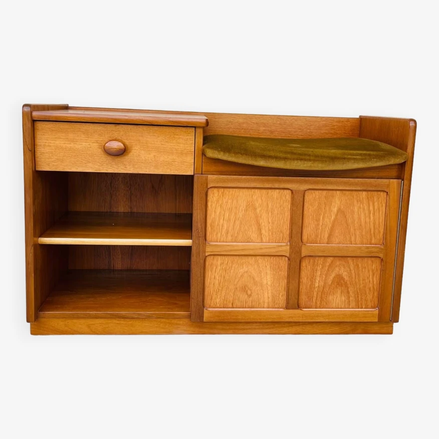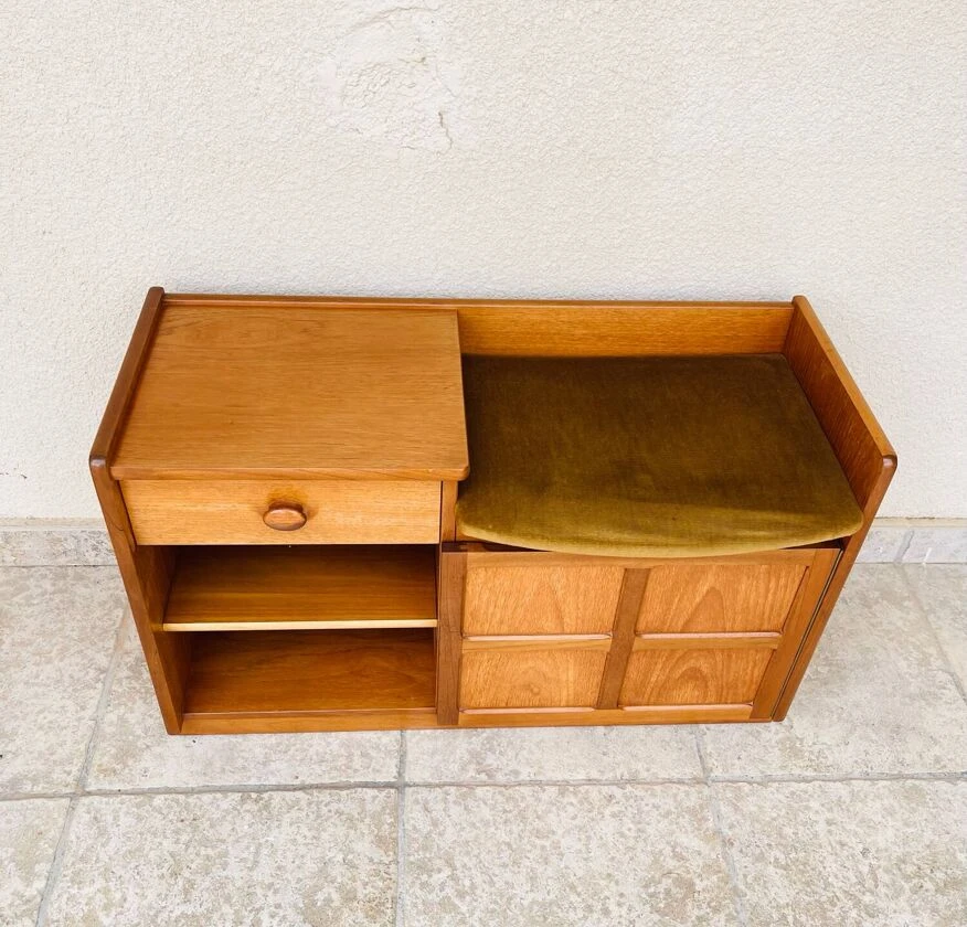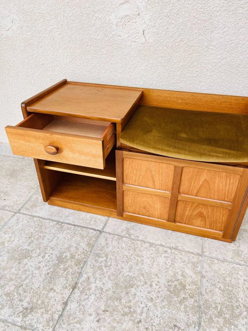 Pretty Scandinavian vintage bench / occasional piece of furniture signed Nathan Furniture. Composed of a khaki green fabric seat, a drawer and a storage door. May show traces of life linked to its age. Dimensions: h56 l91.5 p37 pa39. Delivery possible throughout France.