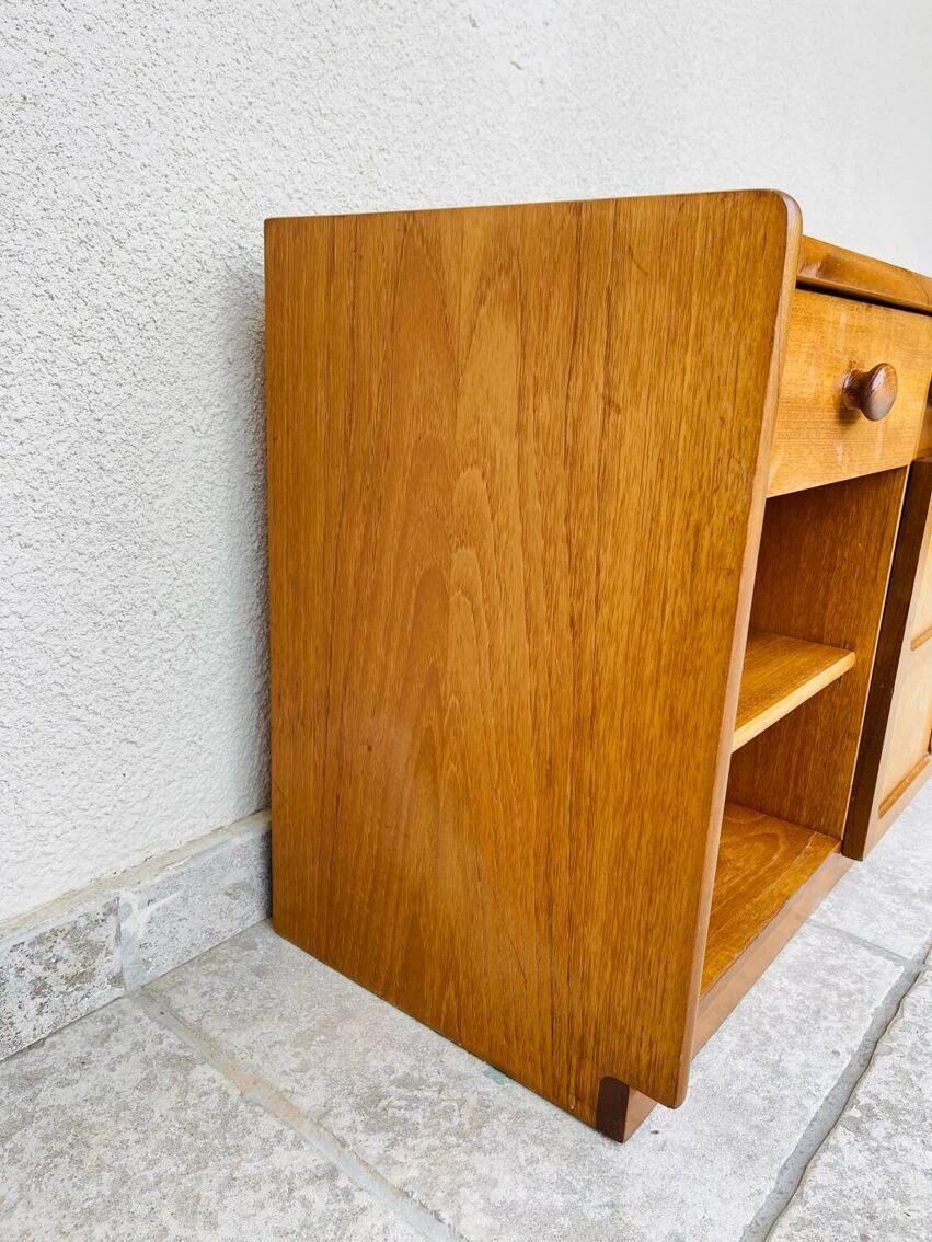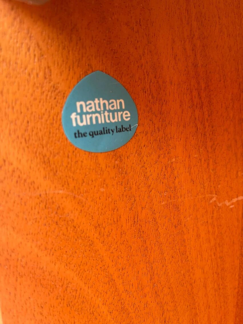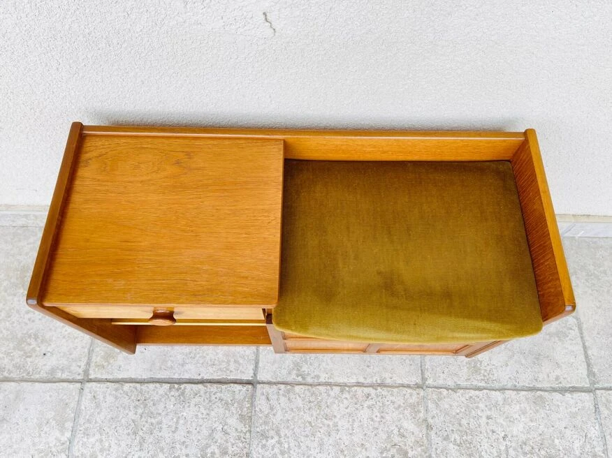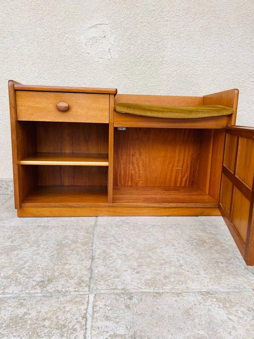 Pretty Scandinavian vintage bench / occasional piece of furniture signed Nathan Furniture. Composed of a khaki green fabric seat, a drawer and a storage door. May show traces of life linked to its age. Dimensions: h56 l91.5 p37 pa39. Delivery possible throughout France.